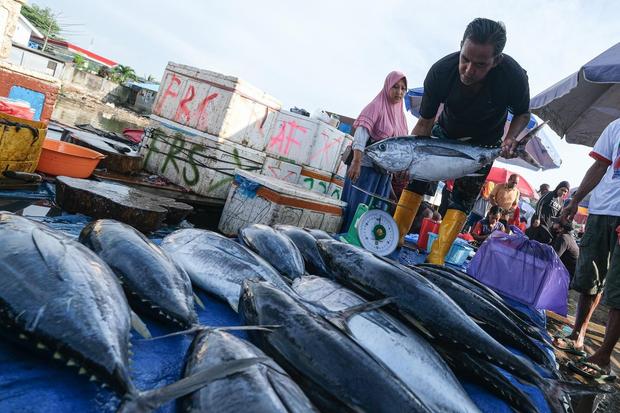 Nelayan menimbang ikan tuna di TPI Higienis Sodoha, Kendari, Sulawesi Tenggara, Rabu (16/4/2025). Fenomena El Nino bisa mendatangkan musim subur di perairan Indonesia.