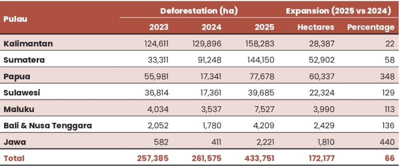 Pada 2025, deforestasi terbesar tercatat di Kalimantan (158.283 hektare), diikuti Sumatra (144.150 hektare), Papua (77.678 hektare), dan Sulawesi (39.685 hektare).