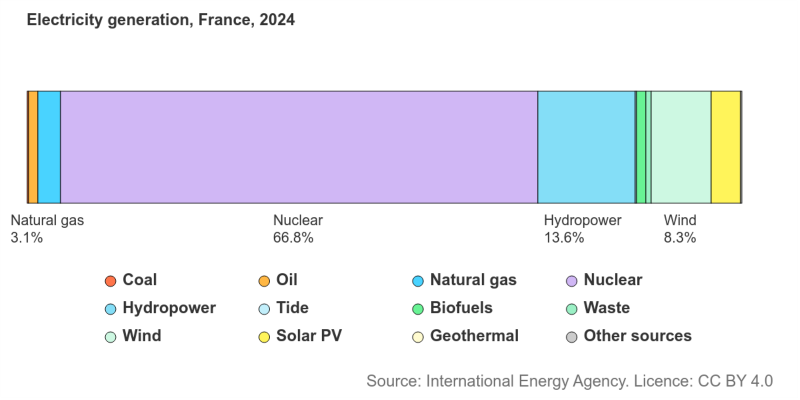 Saat ini, Prancis bisa disebut sebagai salah satu negara yang terdepan dalam soal produksi listrik bersih. Berdasarkan data International Energy Association (IEA), produksi listrik dari pembangkit nuklir Prancis mencapai 380 ribu Gigawatt hour pada 2024. Ini setara 67 persen dari total produksi listrik nasional.