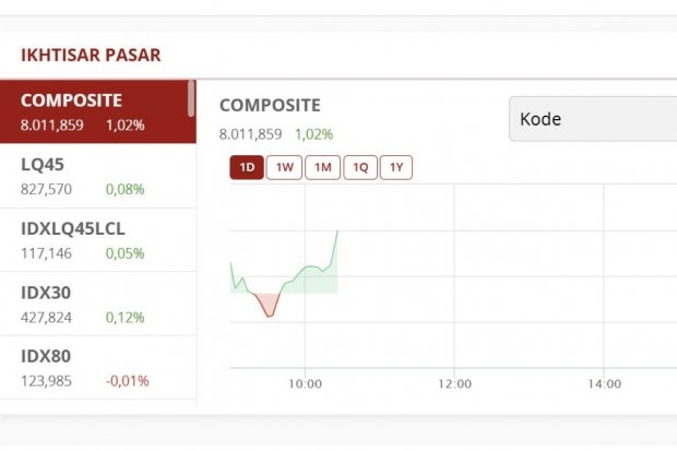 Merujuk data perdagangan Bursa Efek Indonesia, IHSG tercatat bergerak naik 0,99% atau 78,14 poin ke level 8.014 pada perdagangan hari ini dipantau pada pukul 10.29 WIB. Angka tersebut melesat tajam sejak satu pekan terakhir.