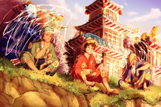 Manga pun beralih ke Ibukota Bunga. Saat semua orang berpesta, Luffy, Zoro, Sanji, dan Jinbe, yang duduk di lereng bukit terlihat memperhatikan pertarungan. Mereka membahas bahwa teman samurainya begitu luar biasa dan betapa kuatnya Haki Shanks. Ryokugyu juga telah pergi di chapter ini.