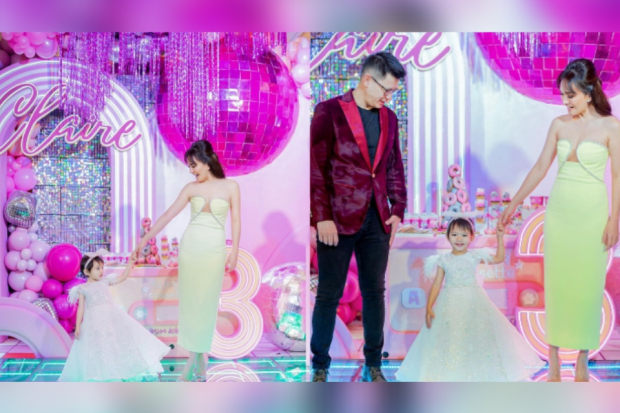 Ternyata selebriti Aura Kasih juga mendapat undangan dari Shandy Aulia. Mengenakan dress pendek, Aura Kasih tiba bersama sang putri, Arabella W. Amaral. Mereka berfoto bersama Claire dan Shandy dengan latar balon besar.