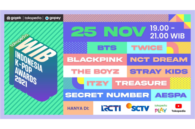 Sementara itu, Tokopedia WIB: Indonesia K-Pop Awards 2021 siap menghadirkan 10 grup Kpop mencakup BTS, TWICE, Blackpink, NCT Dream, THE BOYZ, ITZY, Stray Kids, TREASURE, Secret Number, serta aespa pada Kamis, 25 November 2021, Jangan sampai ketinggalan ya guys!