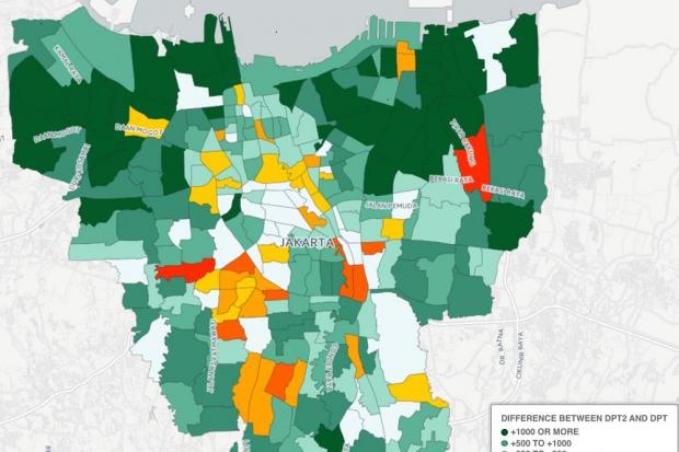 Berdasarkan data tersebut, peta perubahan jumlah DPT sebagian besar terjadi di wilayah Jakarta Barat dan Jakarta Utara. Bahkan, jumlah penambahan DPT di kedua wilayah ini mencapai tiga kali lipat dibandingkan dengan penambahan jumlah penambahan pemilih di wilayah Jakarta Timur.