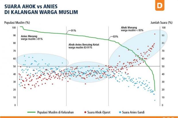 Data yang kami olah dari hasil perolehan suara ketiga pasang kandidat di putaran pertama dikombinasikan dengan jumlah populasi warga muslim di setiap kelurahan mengkonfirmasi temuan dari hasil exit poll Indikator Politik tersebut. Hasil kombinasi kedua data ini menunjukkan bahwa pasangan Anies-Sandi cenderung menang di kelurahan yang menjadi basis warga muslim. Buktinya, pada 20 kelurahan dengan jumlah penduduk muslim lebih dari 91 persen, pasangan Anies-Sandi memperoleh suara lebih dari 50 persen.