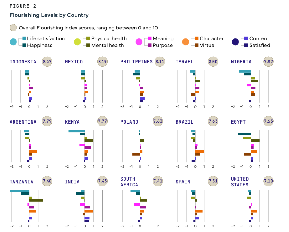 Indonesia, dalam studi tersebut, menduduki peringkat pertama dengan nilai keseluruhan human flourishing tertinggi. Namun, jika mencermati dimensinya, negara ini justru mengalami defisit kepuasan hidup dan kebahagiaan. Keduanya punya angka di bawah 0.
