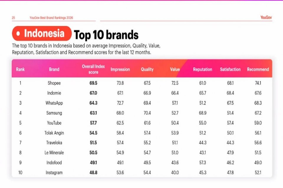 Penilaian dalam survei ini dilakukan oleh lembaga riset global YouGov terhadap jutaan konsumen di 28 negara selama periode Januari hingga Desember 2025.