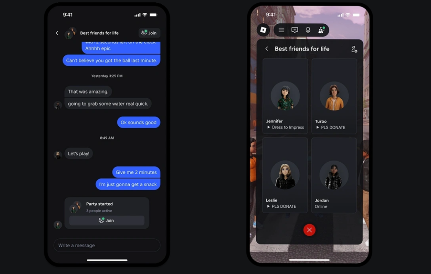 Selain itu, ada fitur Party Chat yang memungkinkan hingga enam teman bergabung dan berpindah pengalaman bersama ke gim maupun dunia virtual lain, serta chat teks untuk pengguna usia 13 tahun ke atas.