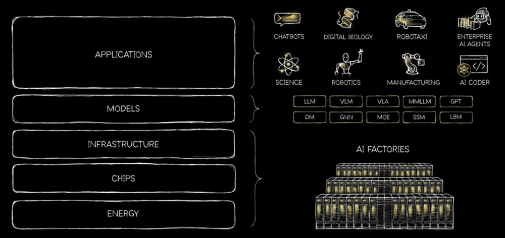 Ia mengutip pernyataan CEO Nvidia Jensen Huang yang diunggah di laman resmi perusahaan, tentang lima lapisan kue yang merujuk pada kecerdasan buatan. Pertama, energi. Kecerdasan yang dihasilkan secara real-time, membutuhkan daya yang dihasilkan secara real-time juga.