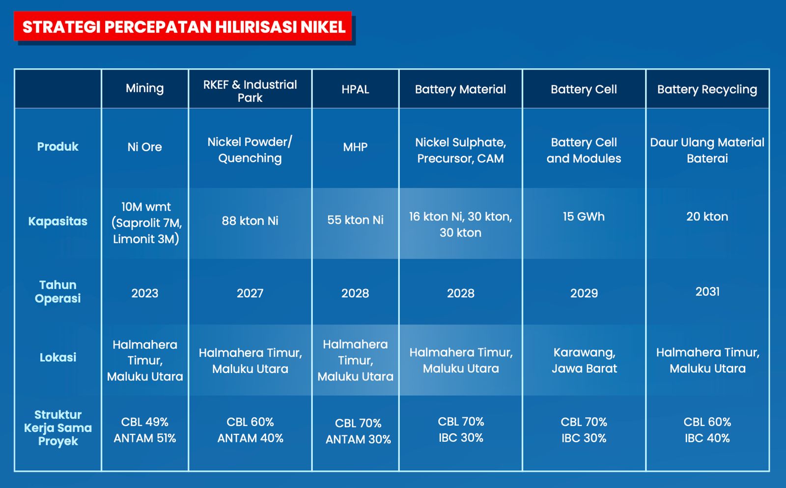 Bersama konsorsium Ningbo Contemporary Brun Lygend (CBL), yang terdiri dari raksasa baterai Cina seperti Contemporary Amperex Technology Co Ltd (CATL) dan Brand & Legend, Antam tengah menggarap pembangunan smelter nikel pirometalurgi berbasis rotary kiln electric furnace (RKEF). Bahkan Antam memegang 40% saham dan nilai proyek ini mencapai sekitar US$ 1,4 miliar atau sekitar Rp 23,03 triliun.