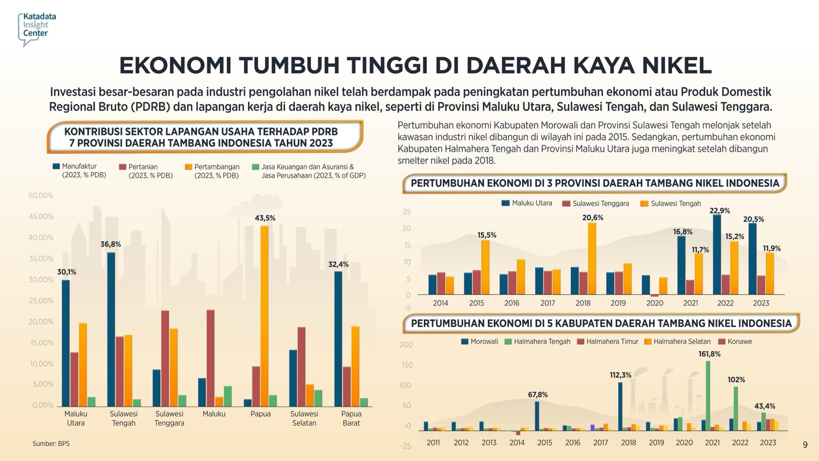 Berdasarkan Katadata Insight Center, kebijakan pemerintah melarang ekspor bijih nikel sejak Januari 2020 menjadi titik balik bagi industri pengolahan mineral di dalam negeri. Alih-alih menurunkan daya saing, aturan ini justru memicu ledakan investasi pembangunan smelter, khususnya oleh investor asal Cina dan Singapura, di berbagai provinsi penghasil nikel.