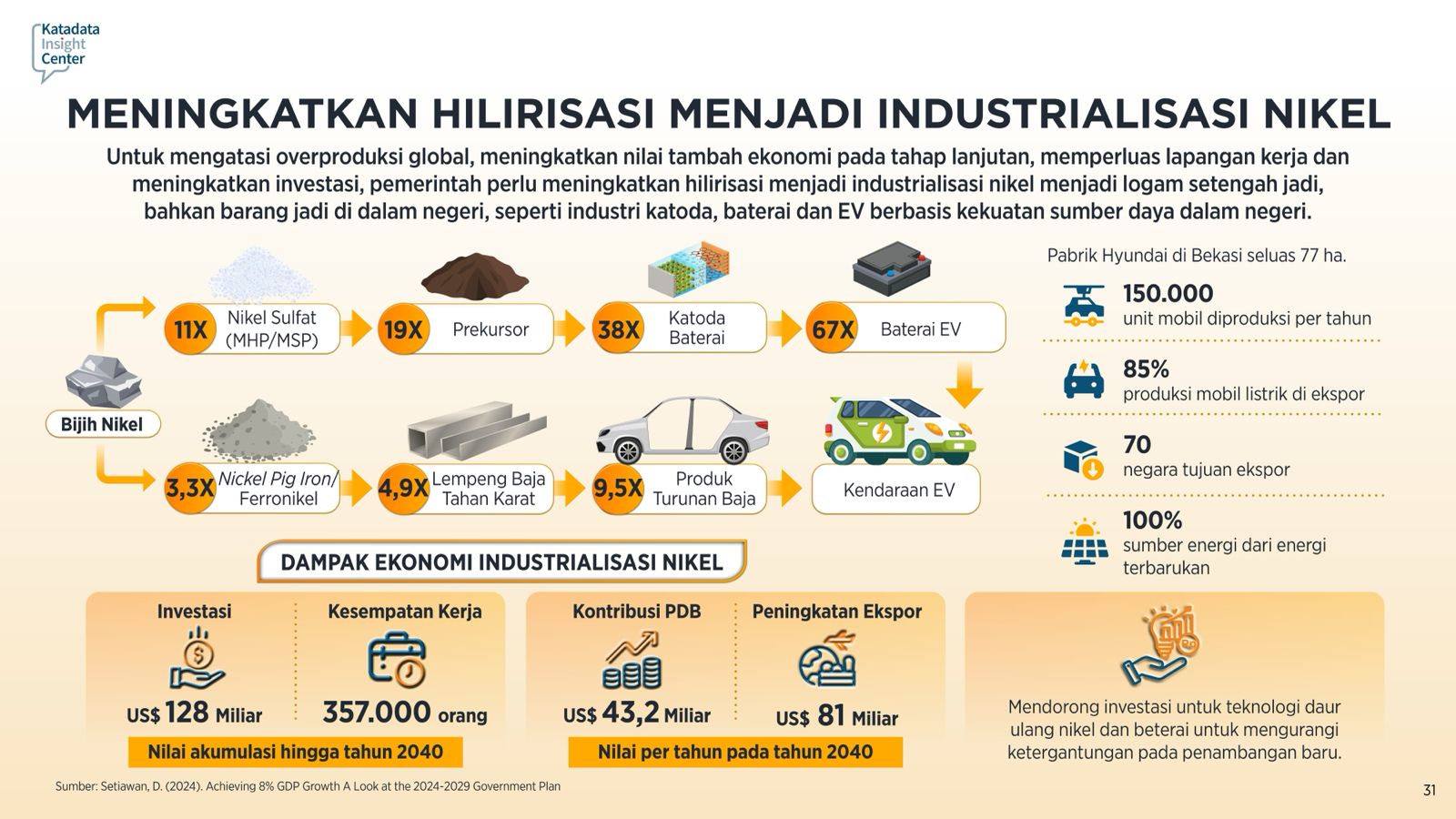 Meski begitu, pemerintah perlu meningkatkan hilirisasi menjadi industrialisasi nikel menjadi logam setengah jadi, bahkan barang jadi di dalam negeri, seperti industri katoda, baterai dan EV berbasis kekuatan sumber daya dalam negeri. Hal itu demi mengatasi overproduksi global, meningkatkan nilai tambah ekonomi pada tahap lanjutan, memperluas lapangan kerja dan meningkatkan investasi.