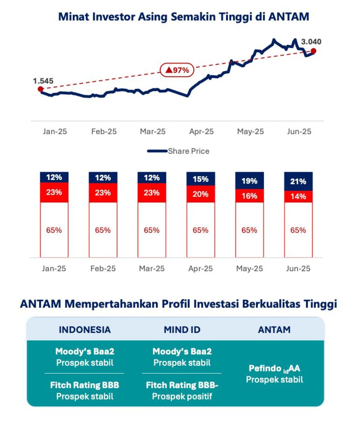 Kenaikan harga saham tersebut sejalan dengan bertambahnya porsi kepemilikan asing Antam. Pada Januari 2025, kepemilikan asing baru mencapai 12%, kemudian meningkat menjadi 15% di April, 19% di Mei, hingga menyentuh 21% pada Juni 2025.