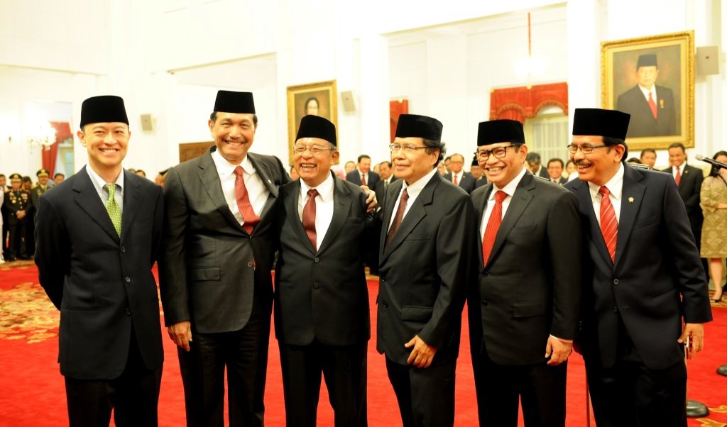 Dari kiri ke kanan, Menteri Perdagangan Thomas Lembong, Menko Polhukam Luhut Panjaitan, Menko Perekonomian Darmin Nasution, MenkoKemaritiman Rizal Ramli, Sekretaris Kebinet Pramono Anung, dan Menteri PPN/ Kepala Bappenas Sofyan Djalil seusai pelantikan.