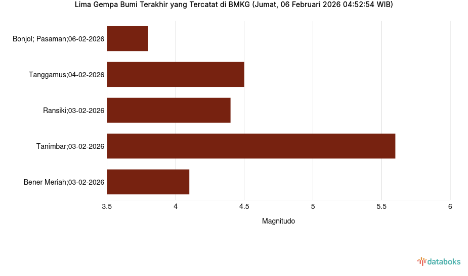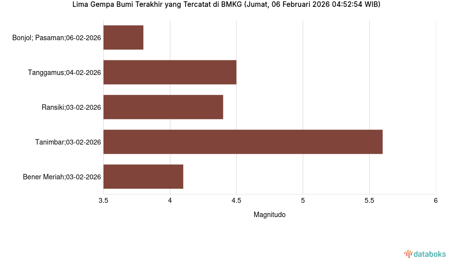 Lima Gempa Bumi Terakhir yang Tercatat di BMKG (Jumat, 06 Februari 2026 04:52:54 WIB) -