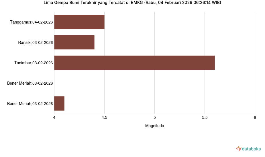Lima Gempa Bumi Terakhir yang Tercatat di BMKG (Rabu, 04 Februari 2026 06:26:14 WIB) -