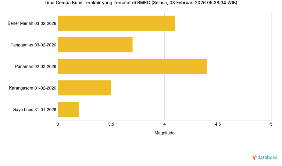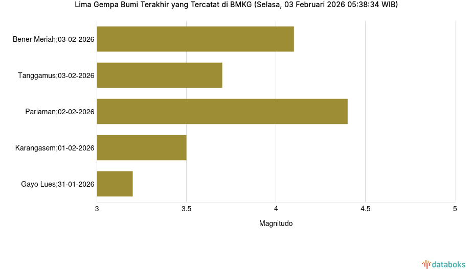 Lima Gempa Bumi Terakhir yang Tercatat di BMKG (Selasa, 03 Februari 2026 05:38:34 WIB) -