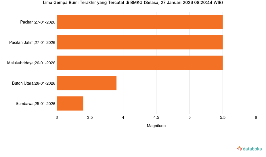 Lima Gempa Bumi Terakhir yang Tercatat di BMKG (Selasa, 27 Januari 2026 08:20:44 WIB)