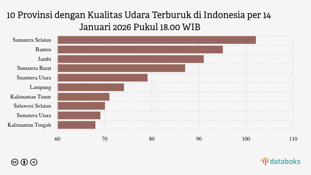 Kualitas Udara Sumatera Selatan Malam Hari (14/1) Terburuk di Indonesia -