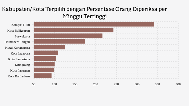 10 Kabupaten/Kota dengan Persentase Orang Diperiksa per Minggu Tertinggi (Kamis, 16 Maret 2023)