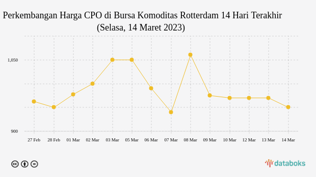 Harga CPO di Bursa Komoditas Rotterdam Turun ke Level US$ 950 per Metrik Ton (Selasa, 14 Maret 2023) -