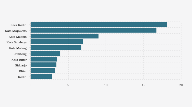 Daftar Kabupaten/Kota dengan Penggunaan Rawat Inap Rumah Sakit Mingguan Terbanyak di Jawa Timur (Selasa, 01 November 2022) -