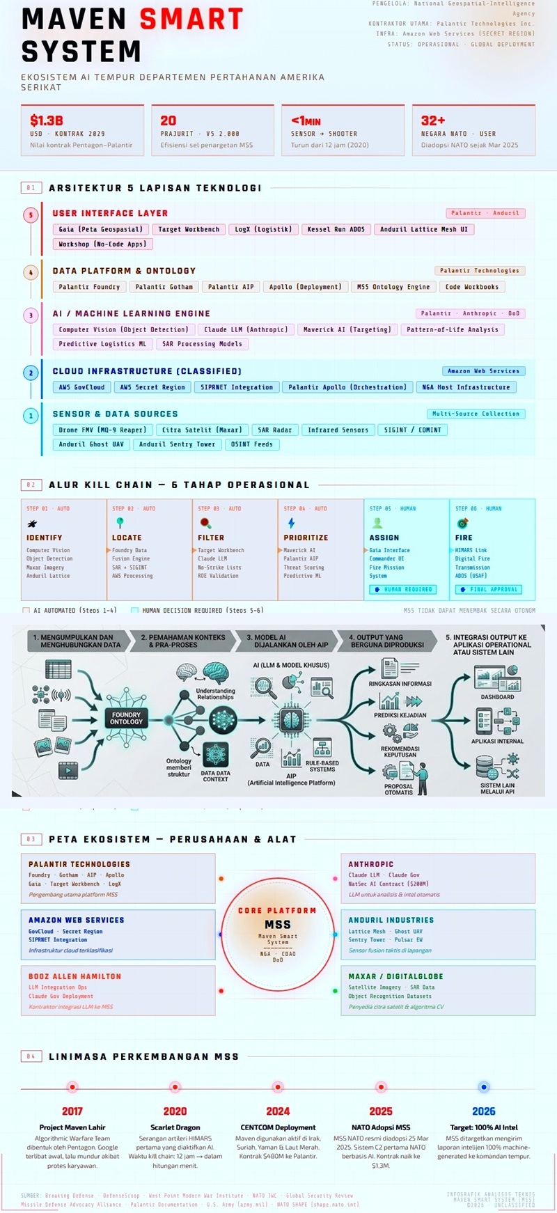 Penggunaan AI dalam operasi militer AS sebenarnya telah dimulai sejak proyek pengolahan citra drone bernama Project Maven pada 2017. Program ini menjadi fondasi bagi berbagai sistem analisis intelijen berbasis algoritma yang kini digunakan Pentagon dalam operasi militer modern. Salah satu sistem yang berkembang dari proyek tersebut adalah Maven Smart System (MSS) yang dilaporkan digunakan dalam operasi militer AS di Iran.