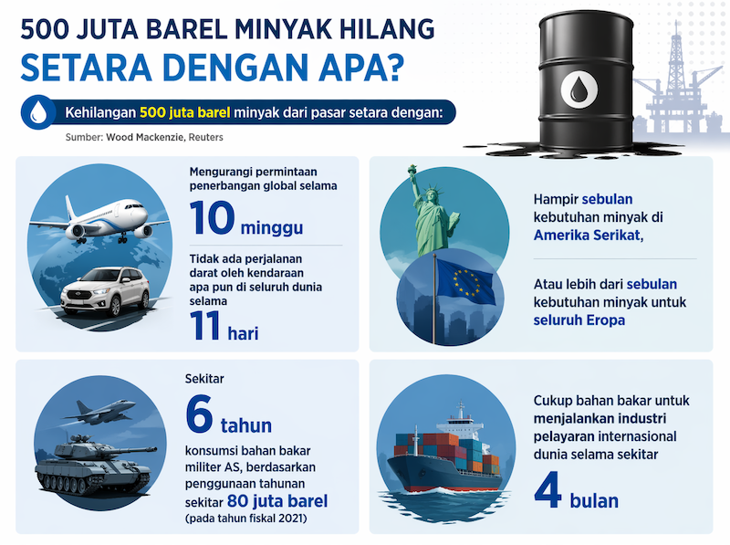 Produksi yang hilang ini bernilai sekitar US$ 50 miliar atau setara Rp 860 triliun, dengan skala setara kebutuhan bahan bakar penerbangan global selama 10 pekan atau konsumsi energi dunia selama beberapa hari. Kerusakan infrastruktur energi di Timur Tengah serta penutupan Selat Hormuz turut memperparah gangguan, dengan produksi yang terganggu hingga sekitar 12 juta barel per hari.