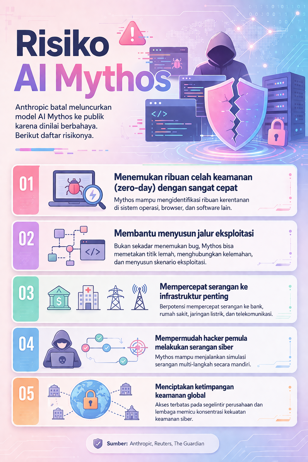 Namun regulasi yang ada dinilai belum cukup untuk menghadapi ancaman yang bergerak jauh lebih cepat. Direktur Eksekutif Indonesia ICT Institute Heru Sutadi menyebut bahwa ancaman dari AI canggih seperti Mythos bersifat berlapis.