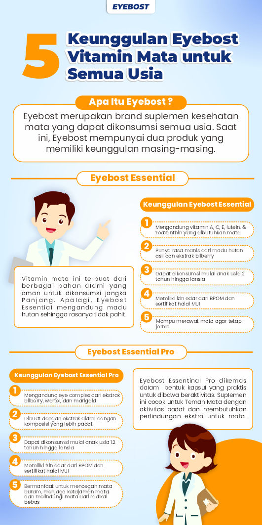Untuk itu, Eyebost hadir sebagai produk suplemen mata yang dapat dikonsumsi oleh semua usia. Produk dari Eyebost dibuat dari bahan alami yang sangat aman untuk dikonsumsi anak-anak maupun lansia.