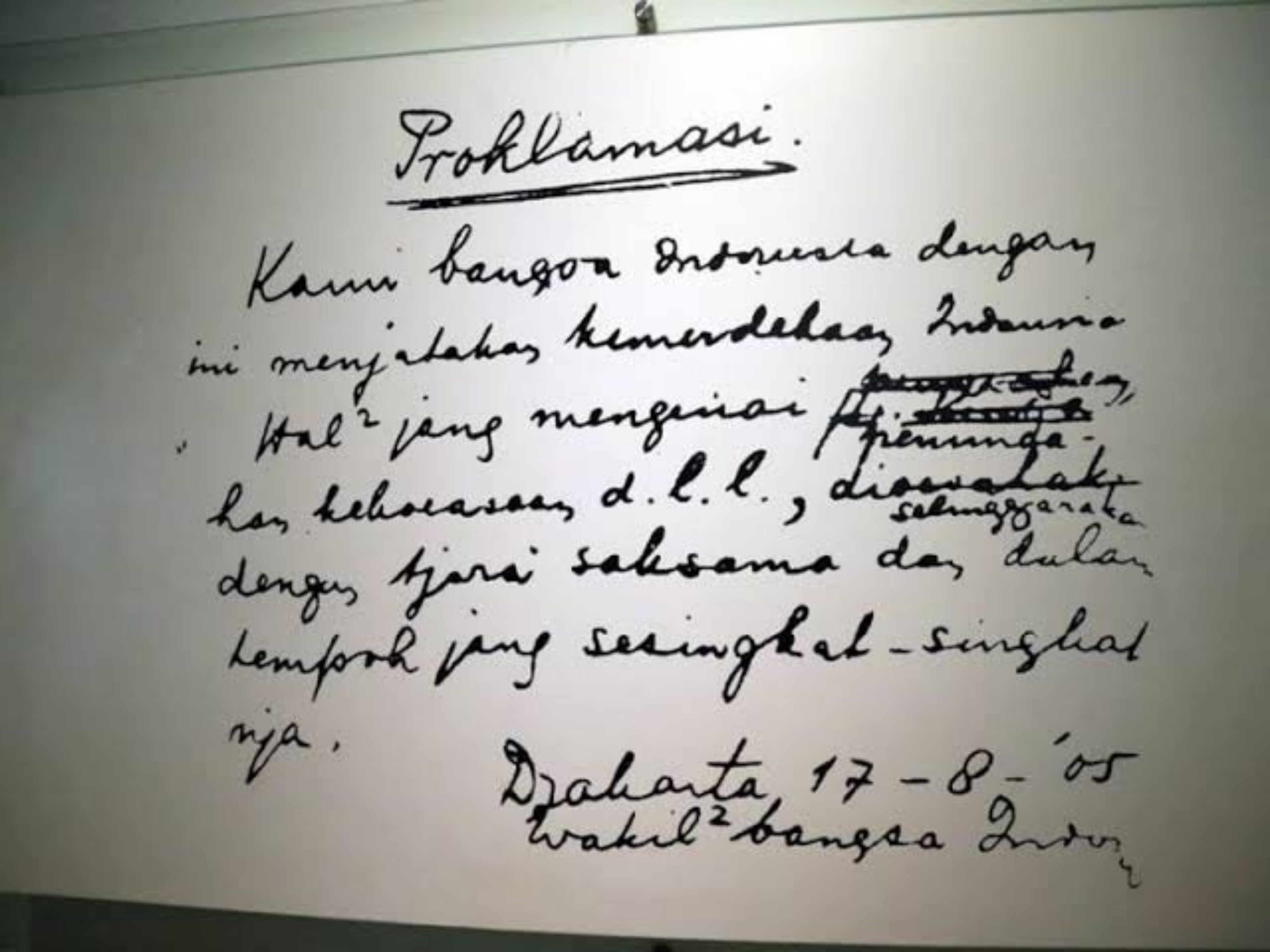 Naskah klad merupakan tulisan tangan asli dari Ir. Soekarno, yang menjadi saksi perumusan kemerdekaan dalam situasi darurat dan tekanan waktu. Teks ini berbunyi: