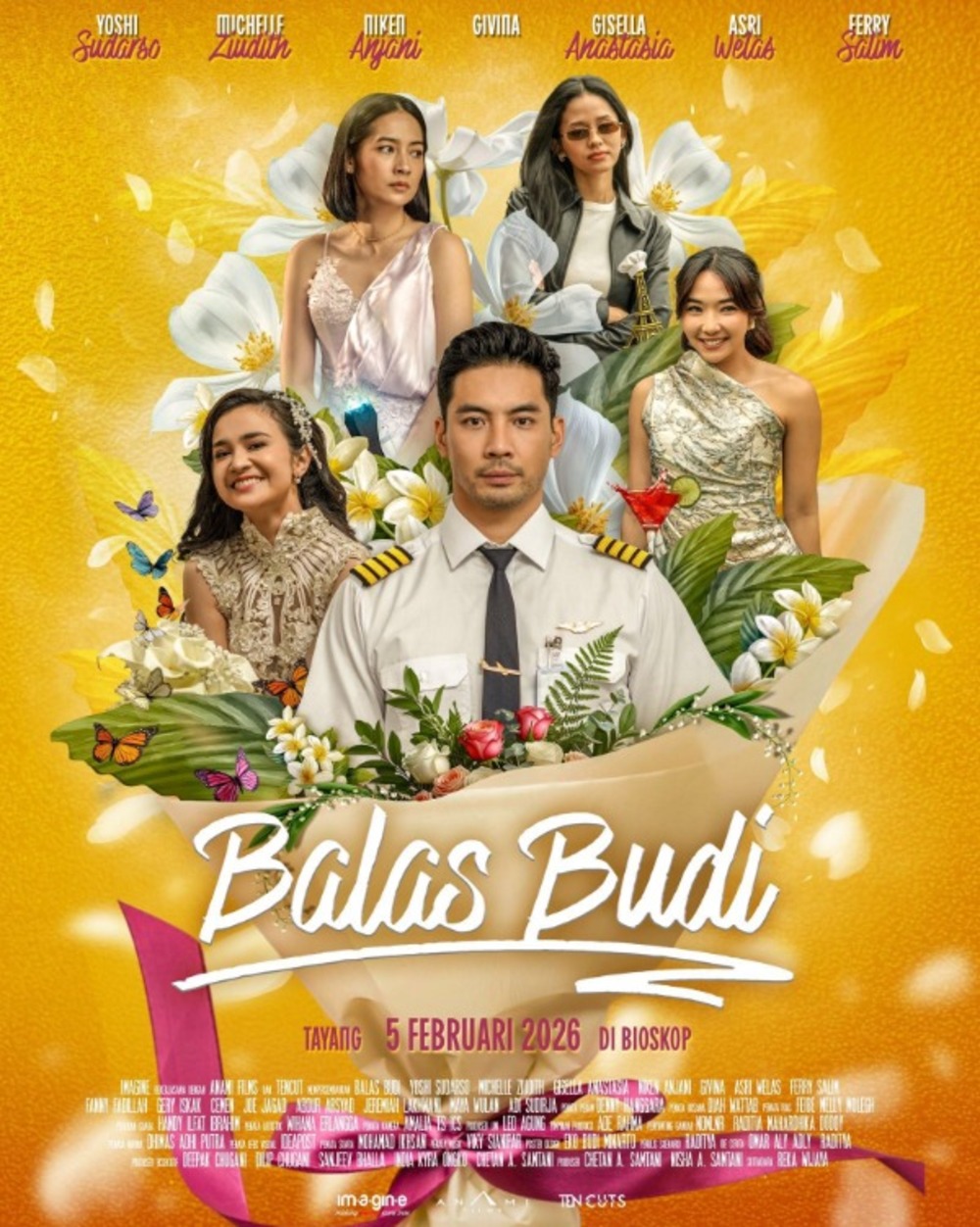 Jadwal film bioskop Februari 2026 yang pertama adalah Balas Budi. Film drama thriller ini menceritakan empat perempuan yang menyamar untuk menjalankan rencana kompensasi terhadap seorang pria bernama Budi.