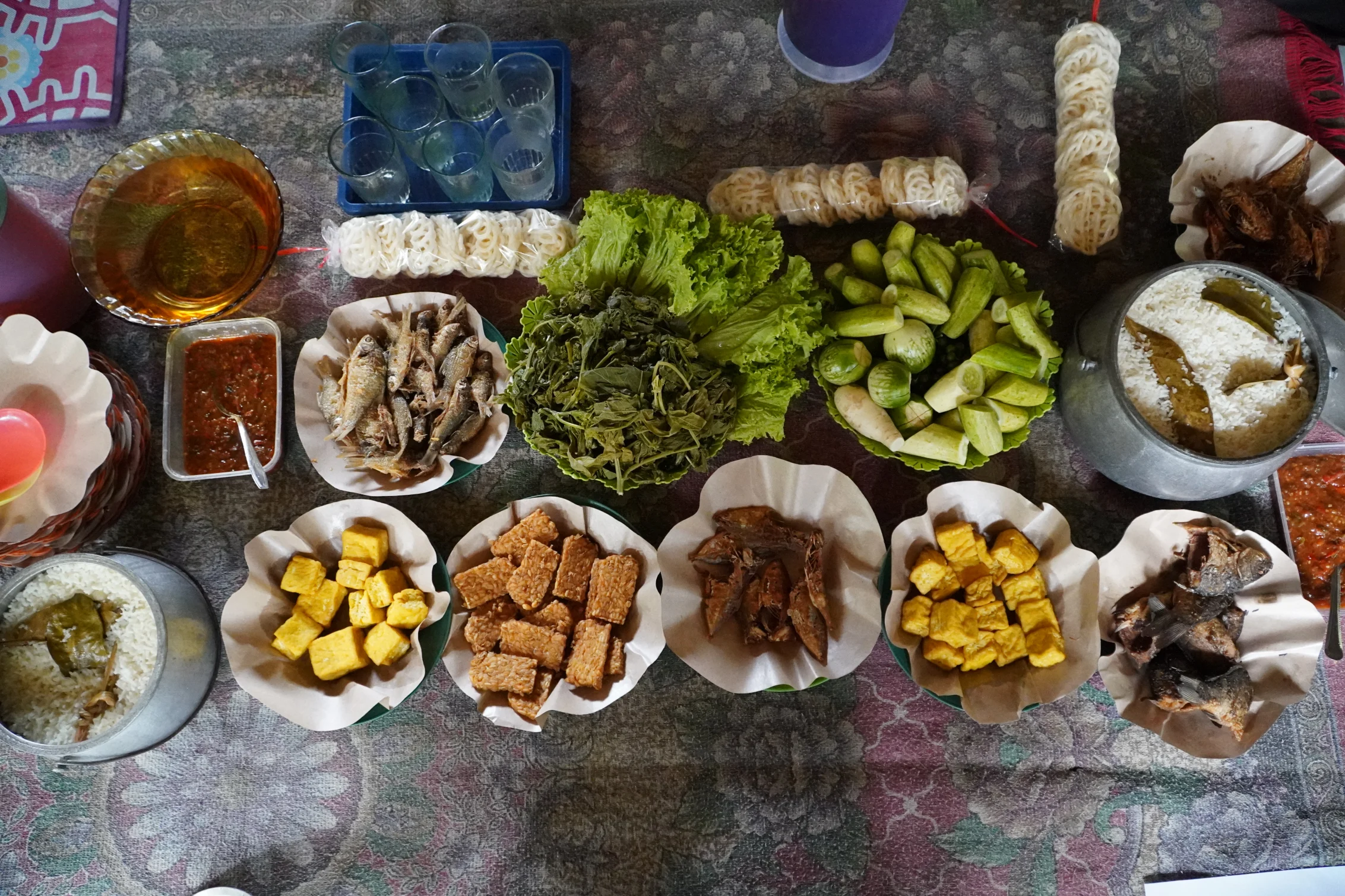 Tersaji nasi liwet di dalam panci kastrol, tahu dan tempe goreng, ikan asin, ikan baung, sambal, kerupuk, dan tentu saja aneka lalapan. Saat tutup panci kastrol dibuka, wangi perpaduan santan, daun salam, dan bawang merebak ke udara. Aromanya sungguh menggoda.