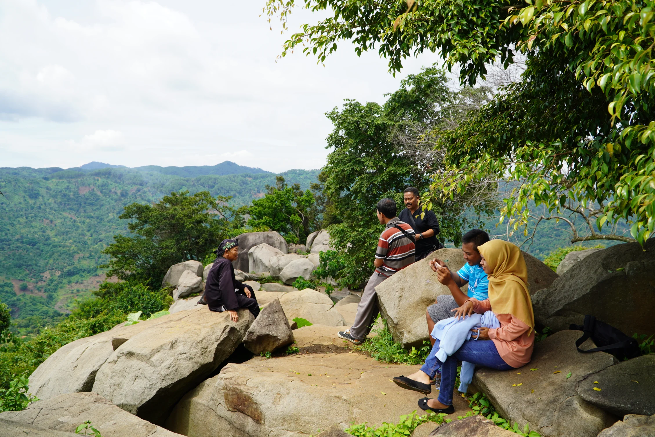 Pengunjung duduk di batu besar sambil berbincang dan menikmati keindahan alam. (Fitria Nurhayati/Katadata)