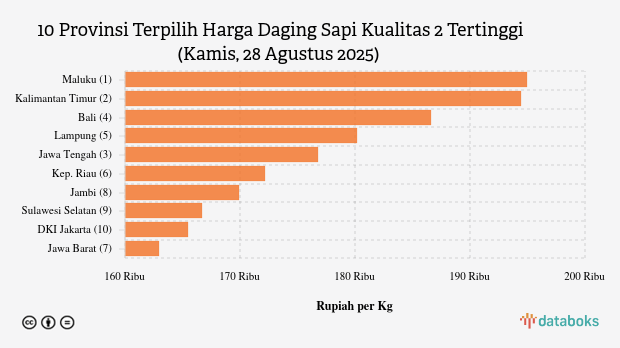 10 Provinsi dengan Harga Daging Sapi Kualitas 2 Paling Mahal (Kamis, 28 Agustus 2025)