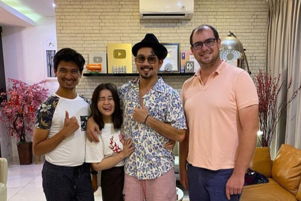 Foto yang diunggah oleh Ragil terlihat dirinya bersama dengan Frederik Vollert, Denny Sumargo beserta istrinya yang bernama Olivia Allan. Melihat unggahan tersebut, Denny mengomentari posenya yang jinjit.