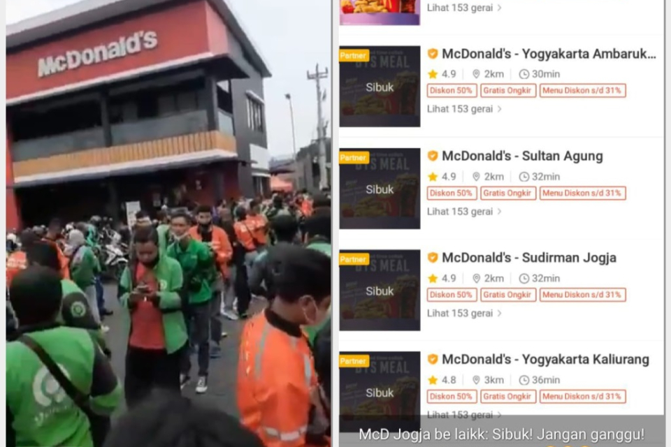 Bergeser ke kota Jogja, antrian panjang para driver ojol yang mendapat orderan BTS Meal terjadi di McDonald's Jalan Kaliurang. Tampak dalam foto di atas, puluhan hingga ratusan driver sedang mengantri. Imbasnya, gerai McDonald's di sejumlah cabang Jogja dikabarkan terpaksa langsung ditutup.