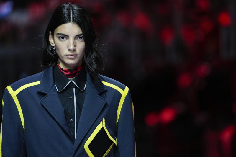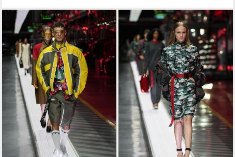 Para model berjalan memperagakan hasil karya direktur kreatif Rocco Lannone yang memiliki kekuatan pada pakaian luar terstruktur yang kontras dengan sutra, dicetak cerah dan cair dalam warna merah Ferrari, Scuderia kuning dan biru elektrik.